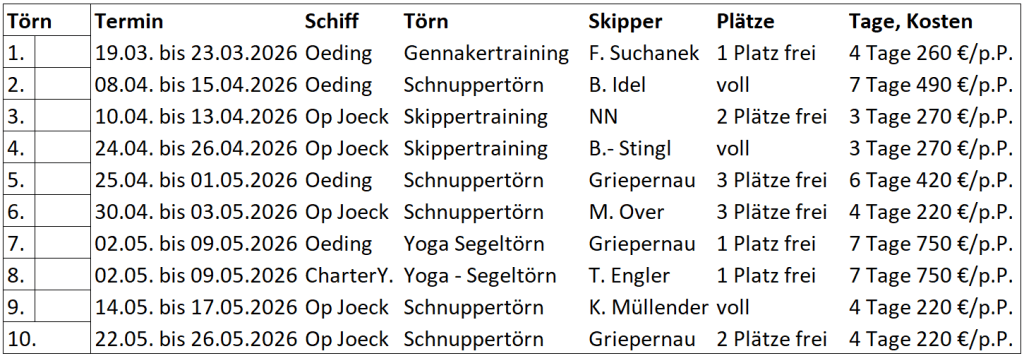 Sollte es weitere Törnwünsche geben, bitte in der Geschäftstelle, oder beim Fahrtensegelwart melden.